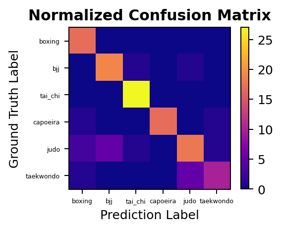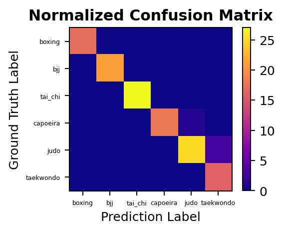 We can then analyze performance on the test set, for which we obtain a mean class accuracy of 97.34% (top1_acc: 0.9688, top5_acc: 1.0000), which is quite high for such a short training regime. We can also plot the confusion matrix for this model, and see how few mistakes it actually does in the test set. All in all, a highly successful model but we recall that it learns from the full RGB video data. We want to go one step further and train a model to learn just from the motion of each martial art practitioner.