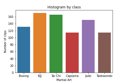 For the first built dataset, six popular martial arts were chosen as classes: Boxing, Brazilian Jiu-Jitsu (BJJ), Tai Chi, Capoeira, Judo and Taekwondo. These disciplines were chosen not just because of their popularity but also because of the notable physical difference among them, as a first approach to this problem. A number of videos were obtained from the web from differing search queries to represent a wide array of scenarios. A script was developed to extract a consistent amount of ~10 seconds-clips from this batch of videos. After a period of manually cleaning the extracted clips, a first dataset of 849 clips was constructed. It was then split into training, validation and testing subsets as is customary, in a chosen split of (0.7, 0.15, 0.15). The distribution of this first (full) dataset among the classes can be seen in the histogram below.